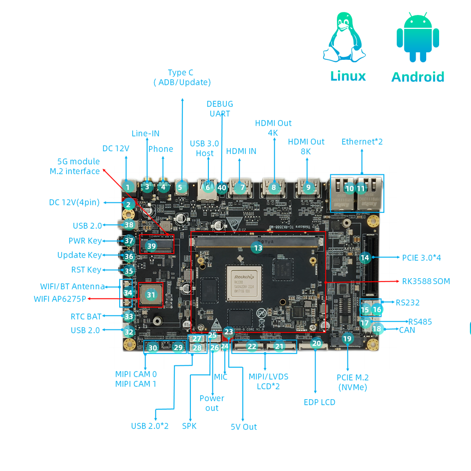• RK3588 SBC-fördelar: Jämfört med Raspberry Pi-produkter erbjuder RK3588-utvecklingskortet överlägsen prestanda, rikare gränssnitt och kraftfullare multimediabehandlingsmöjligheter, vilket gör det mer lämpligt för AI och industriella applikationer.